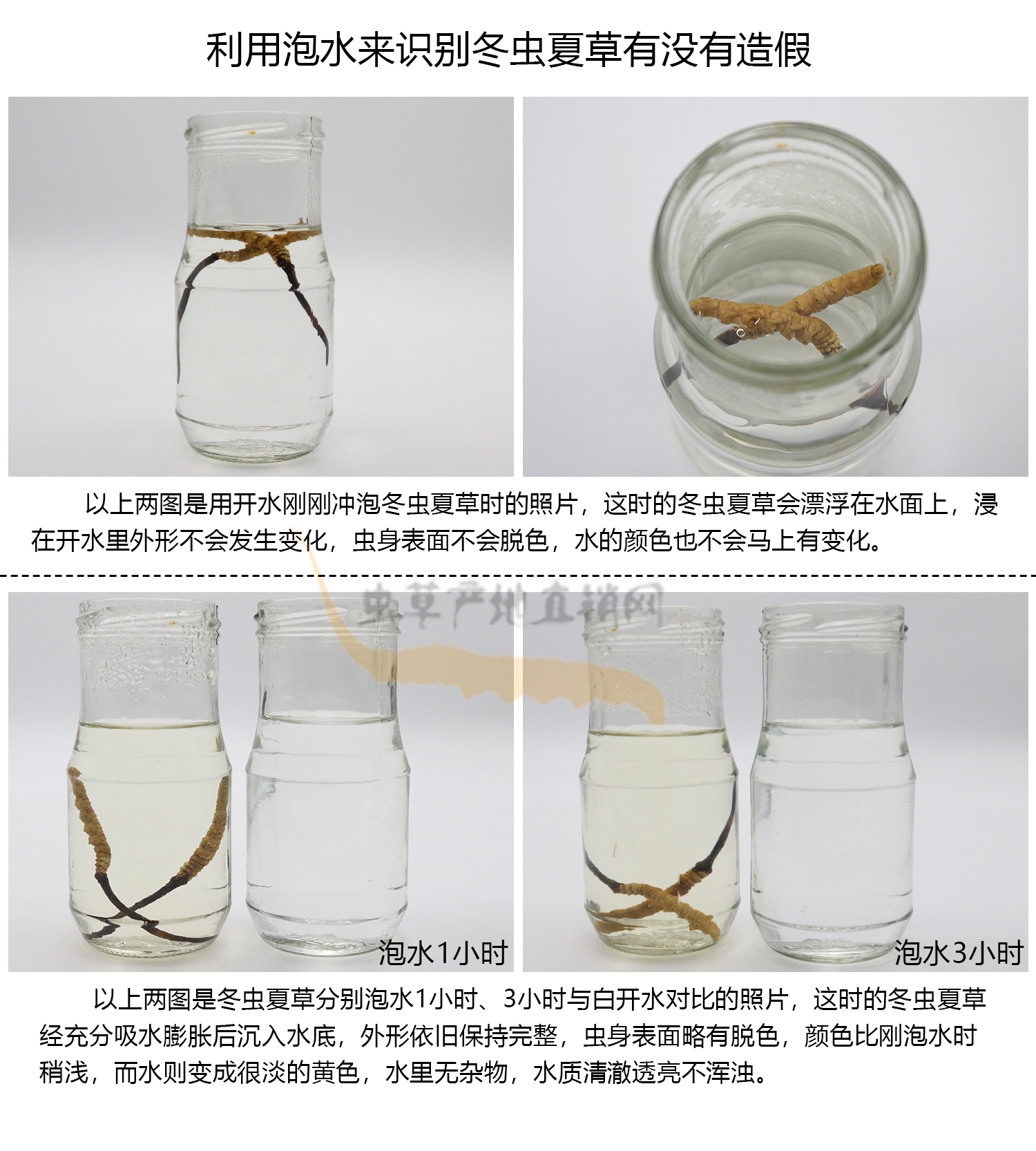 通過觀察上面的冬蟲夏草泡水圖片,我們從反向推理,可得出以下6個關于識別真假冬蟲夏草的結論: